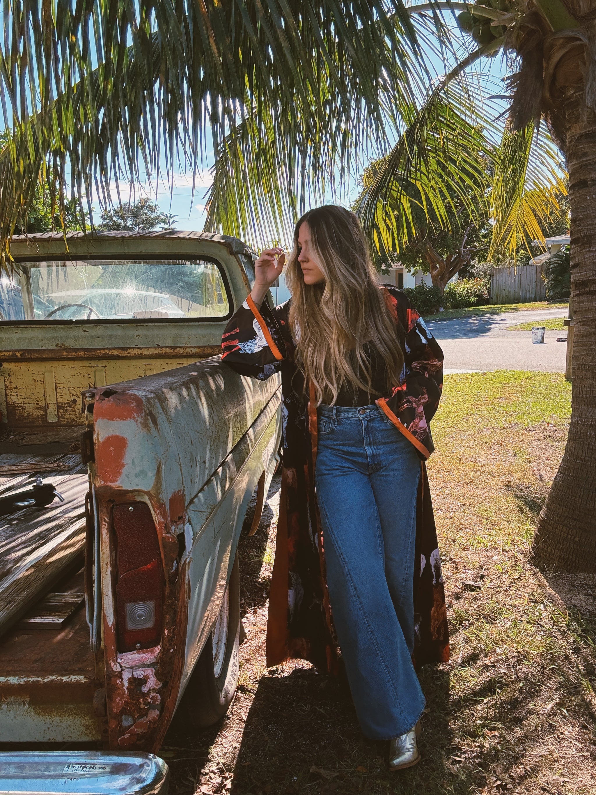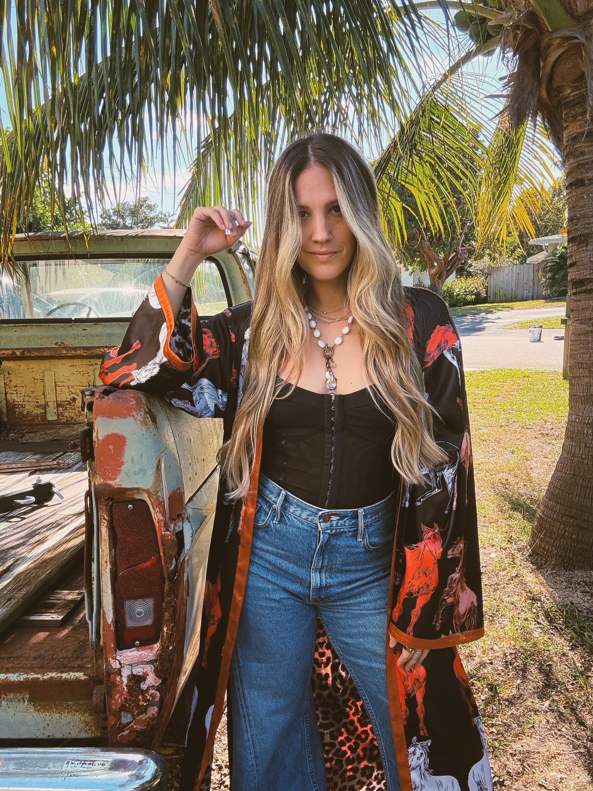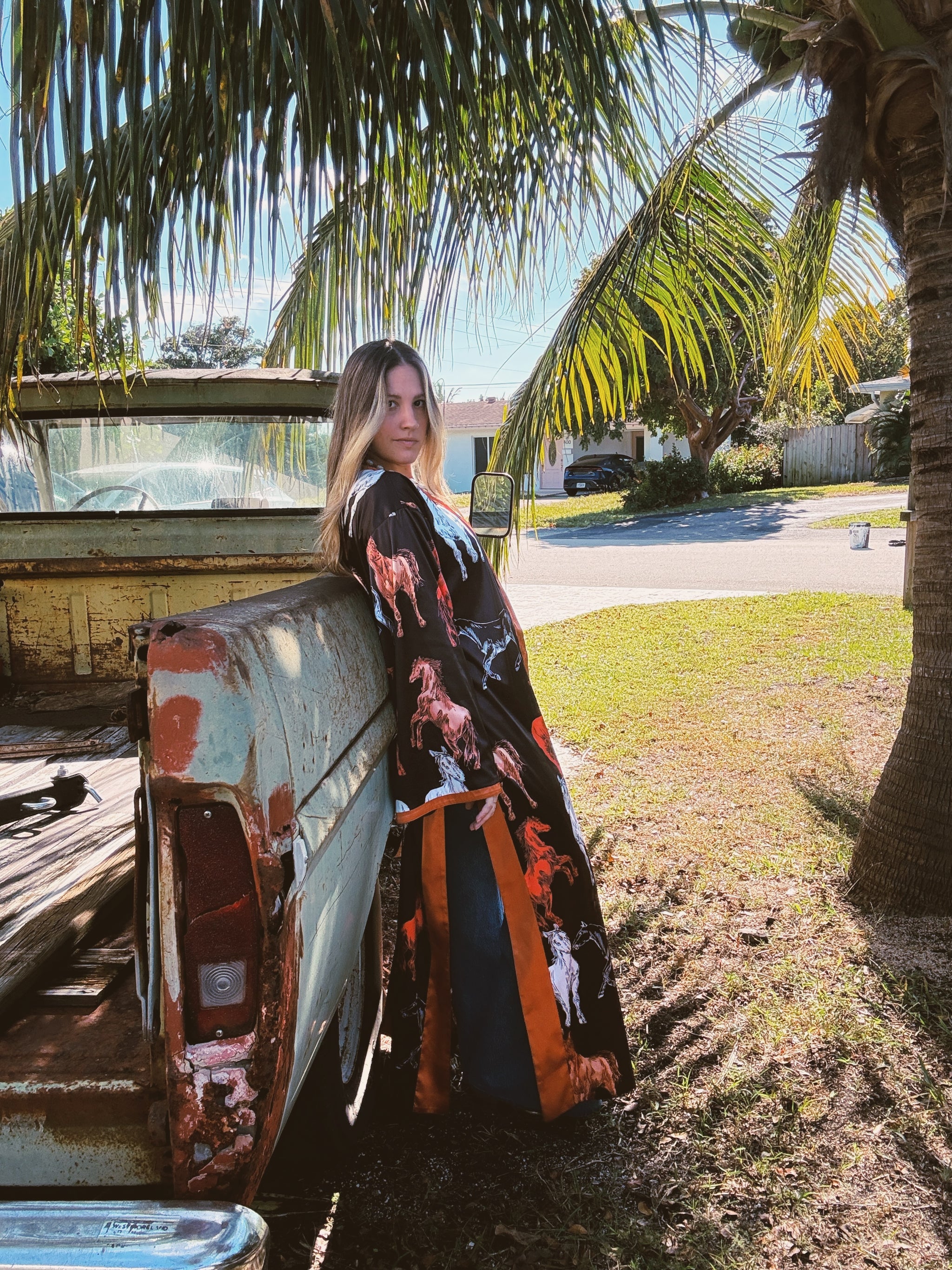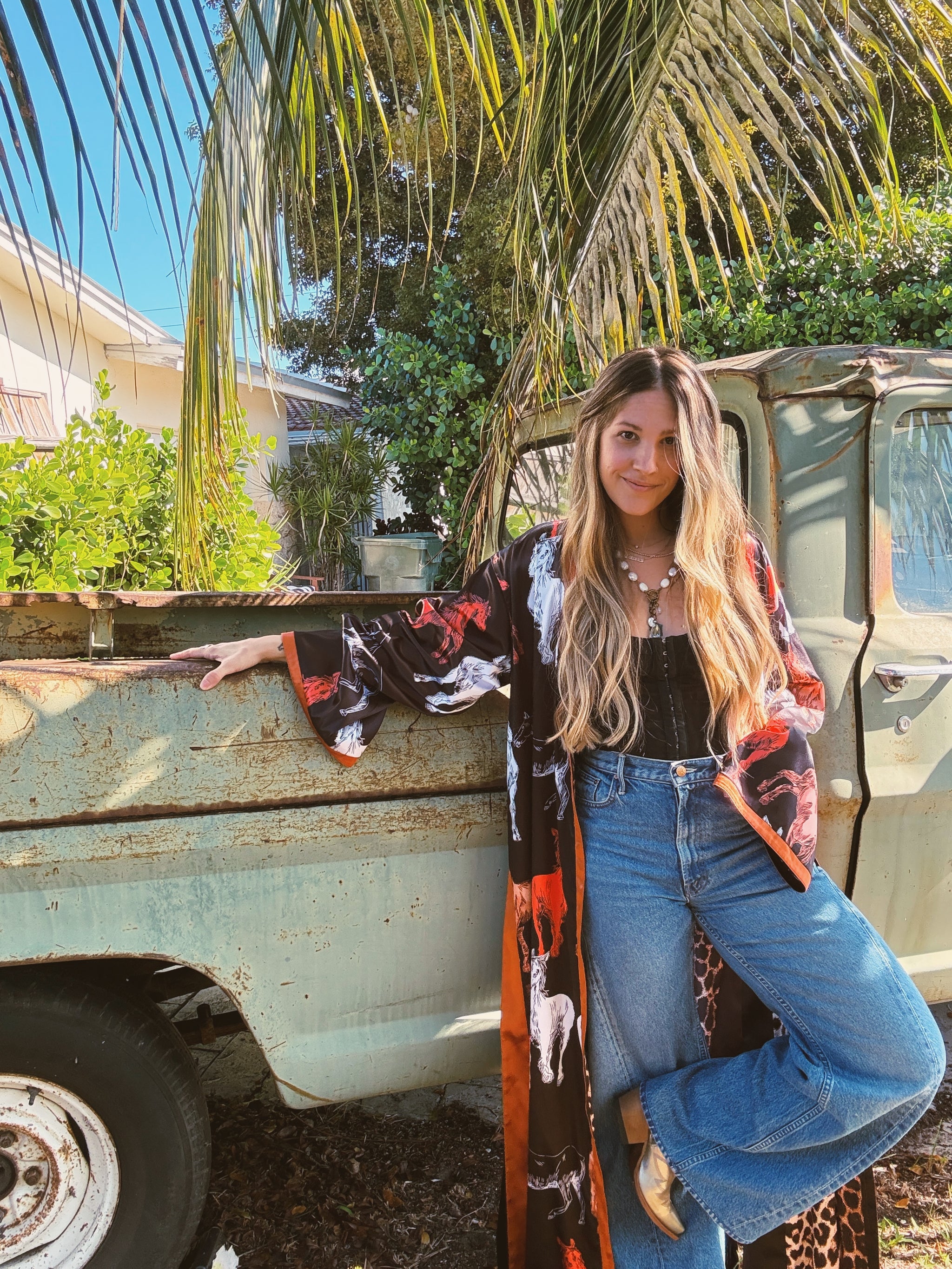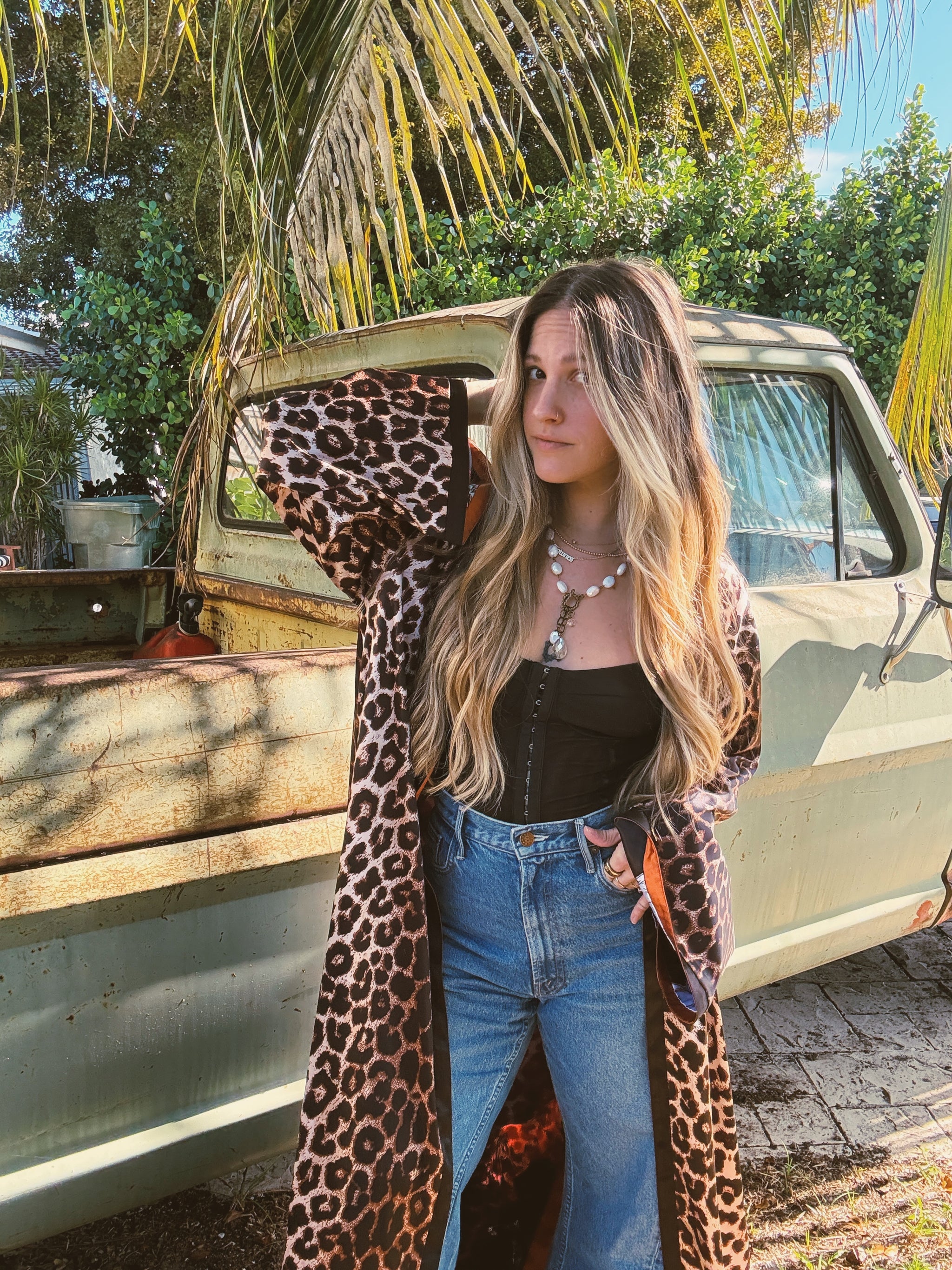 Reversible Duster Dark Horse & Leopard Print Rusty Orange Contrasting Detail Reversible Design Longline Side Slits Wide Sleeve 56" Down...