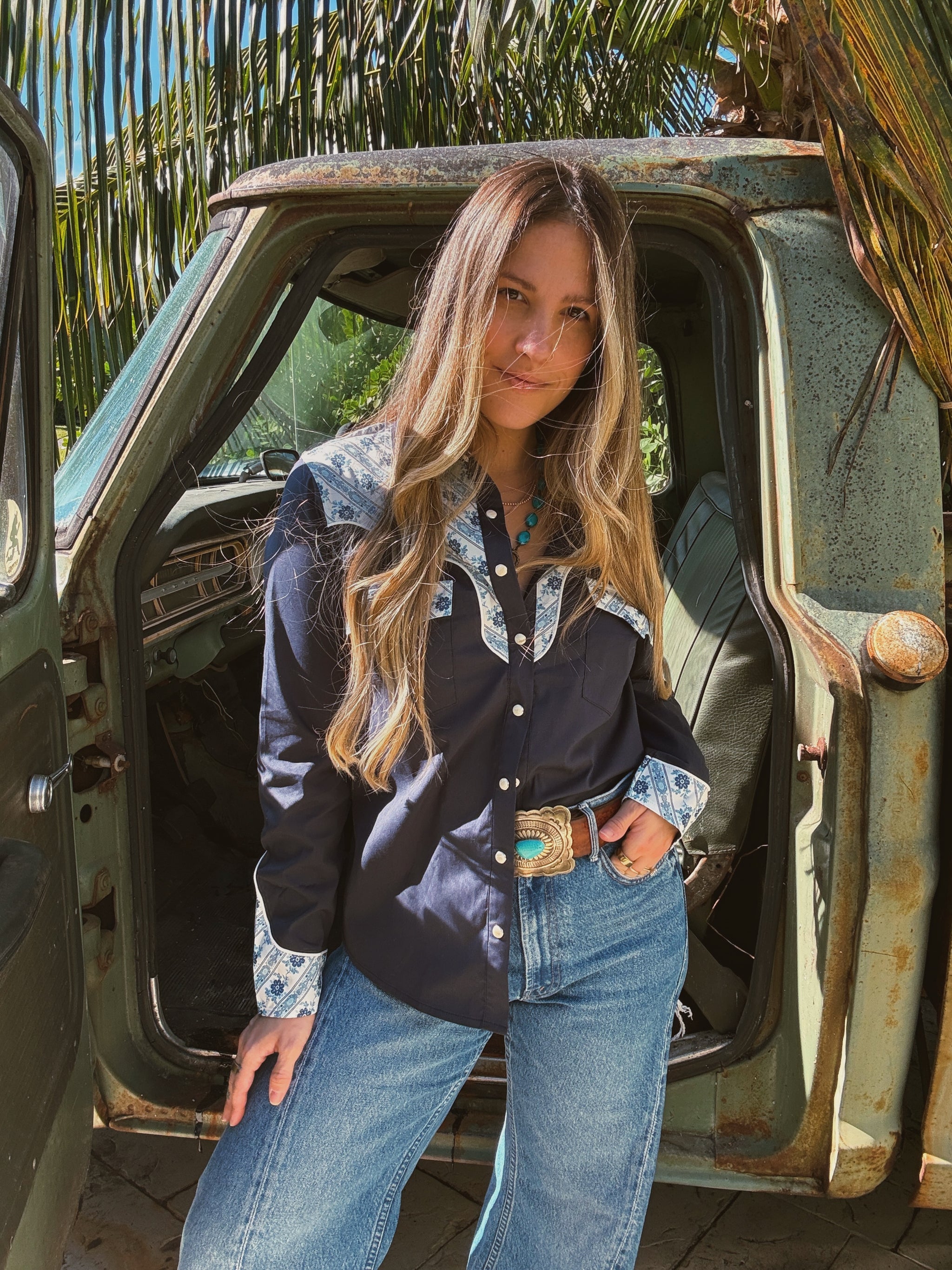 Western Pearl Snap Button Up Top Denim Blue w/ Blue & Cream Floral Detail Cream Piping Detail Chest Pockets w/...