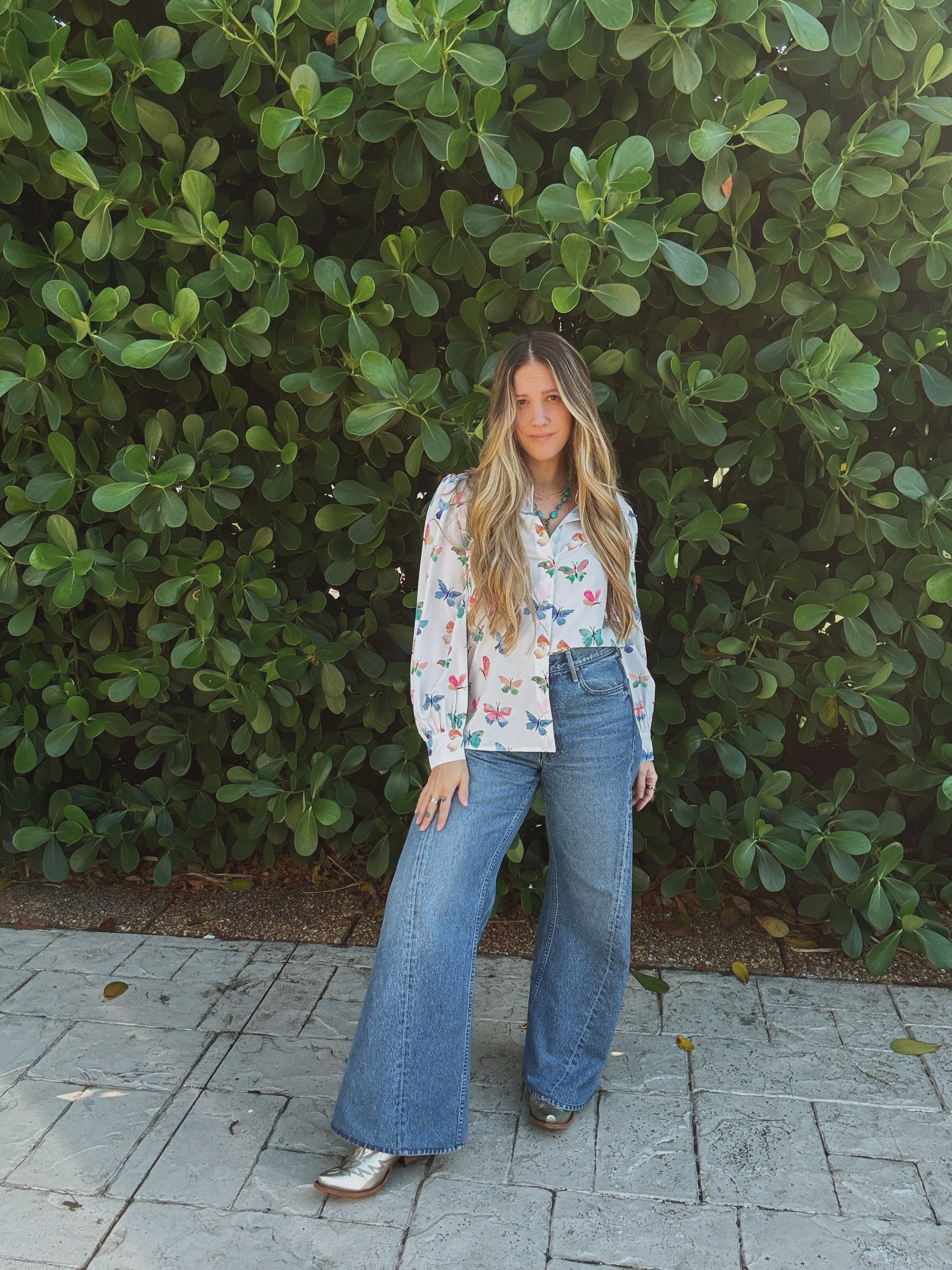Butterfly Button Up Blouse Multi Color Butterfly Print Vintage Inspired Slight Pouf Shoulder Button Up Front Side Slit Detail Lil...