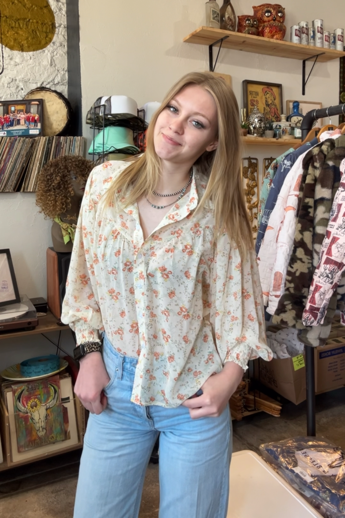 Floral Yoke Blouse Long Sleeve Button Front Collard Balloon Sleeve w/ Elastic Wrist Lightweight/Sheer Sizing Recommendations Small 0/2/4 Medium 4/6/8...