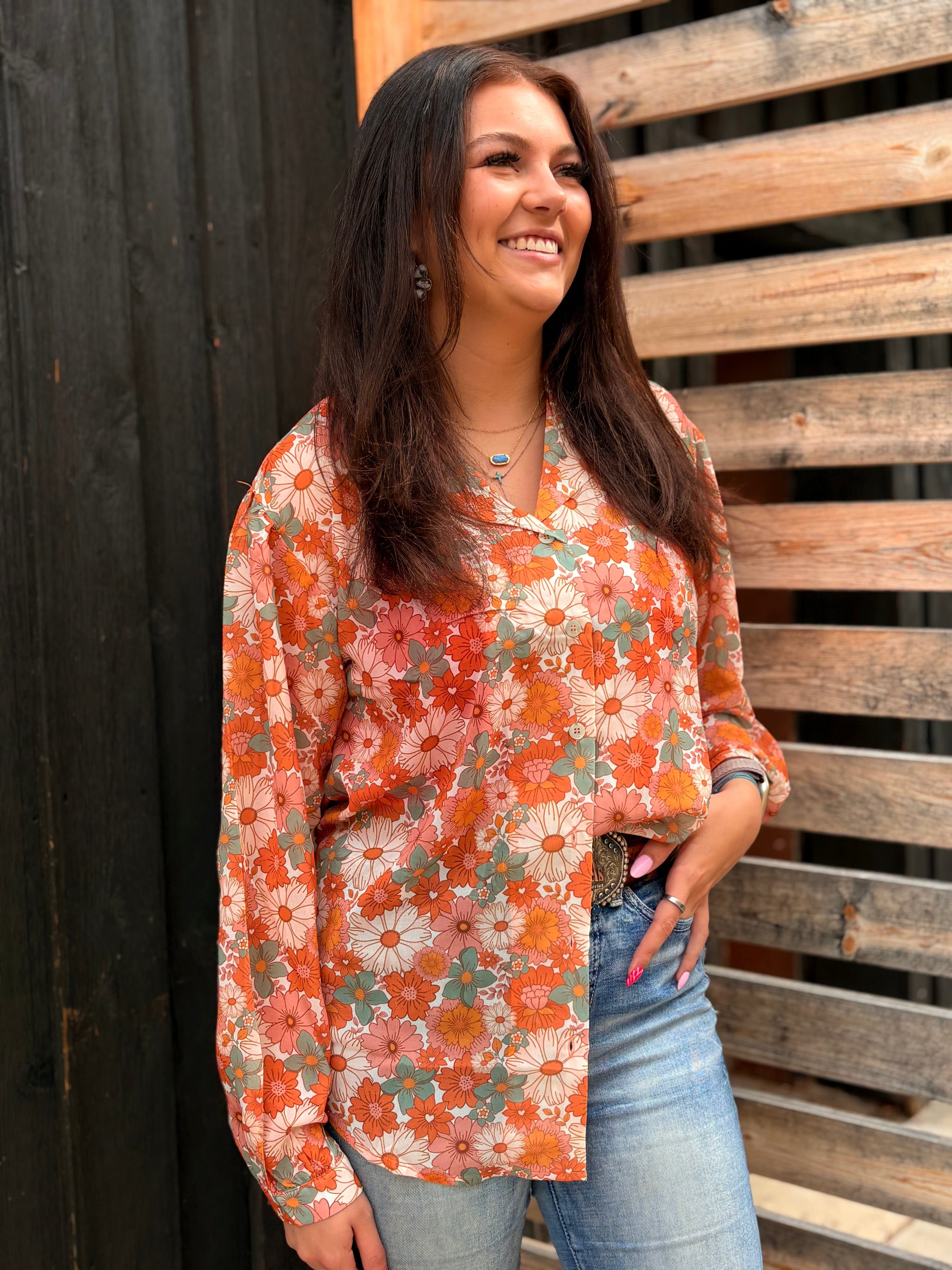 Retro Heart Button Up Blouse Beautiful Brown & Cream Retro Heart Design Pouf Shoulder Button Up Front Side Slit Detail...
