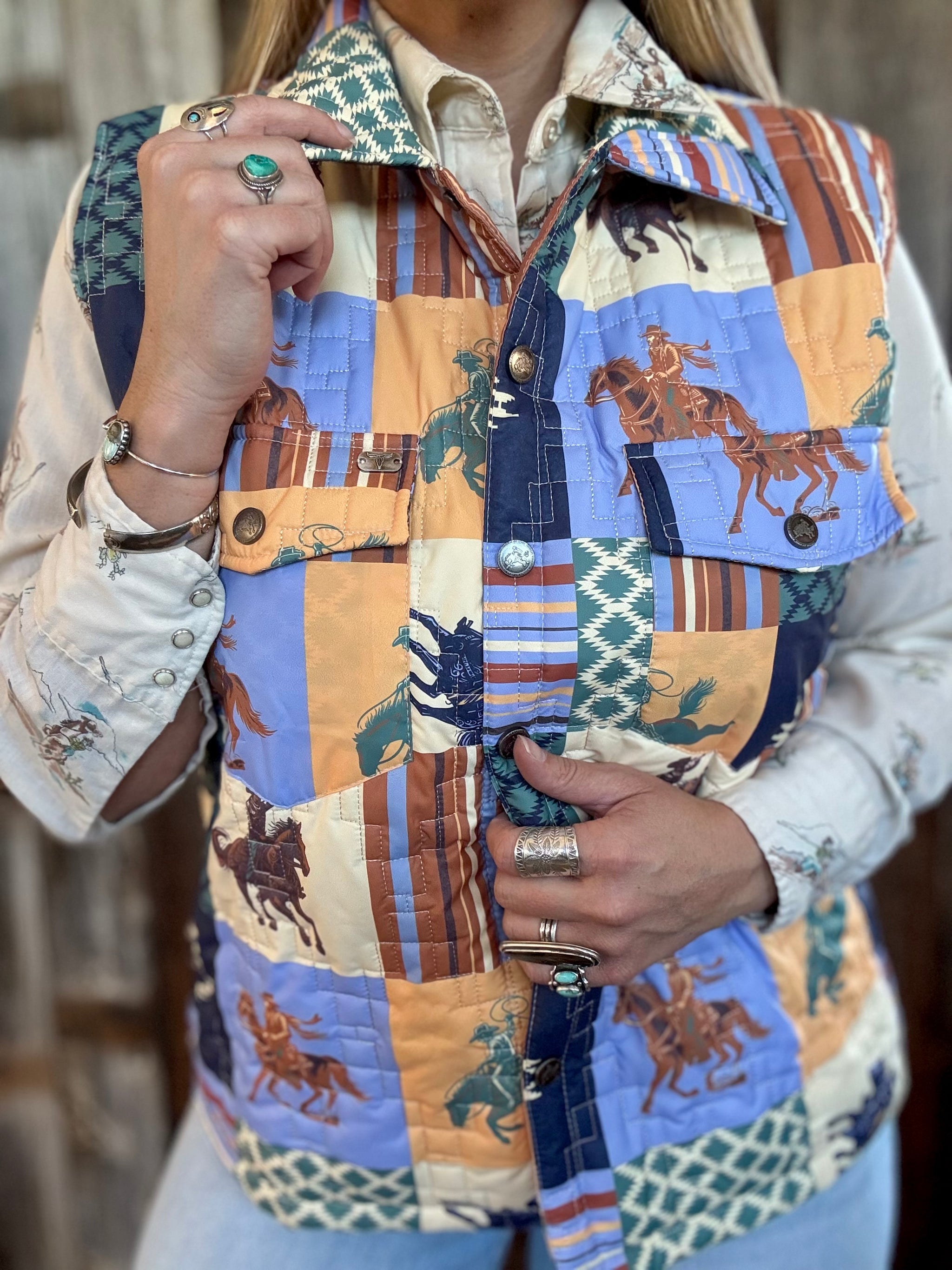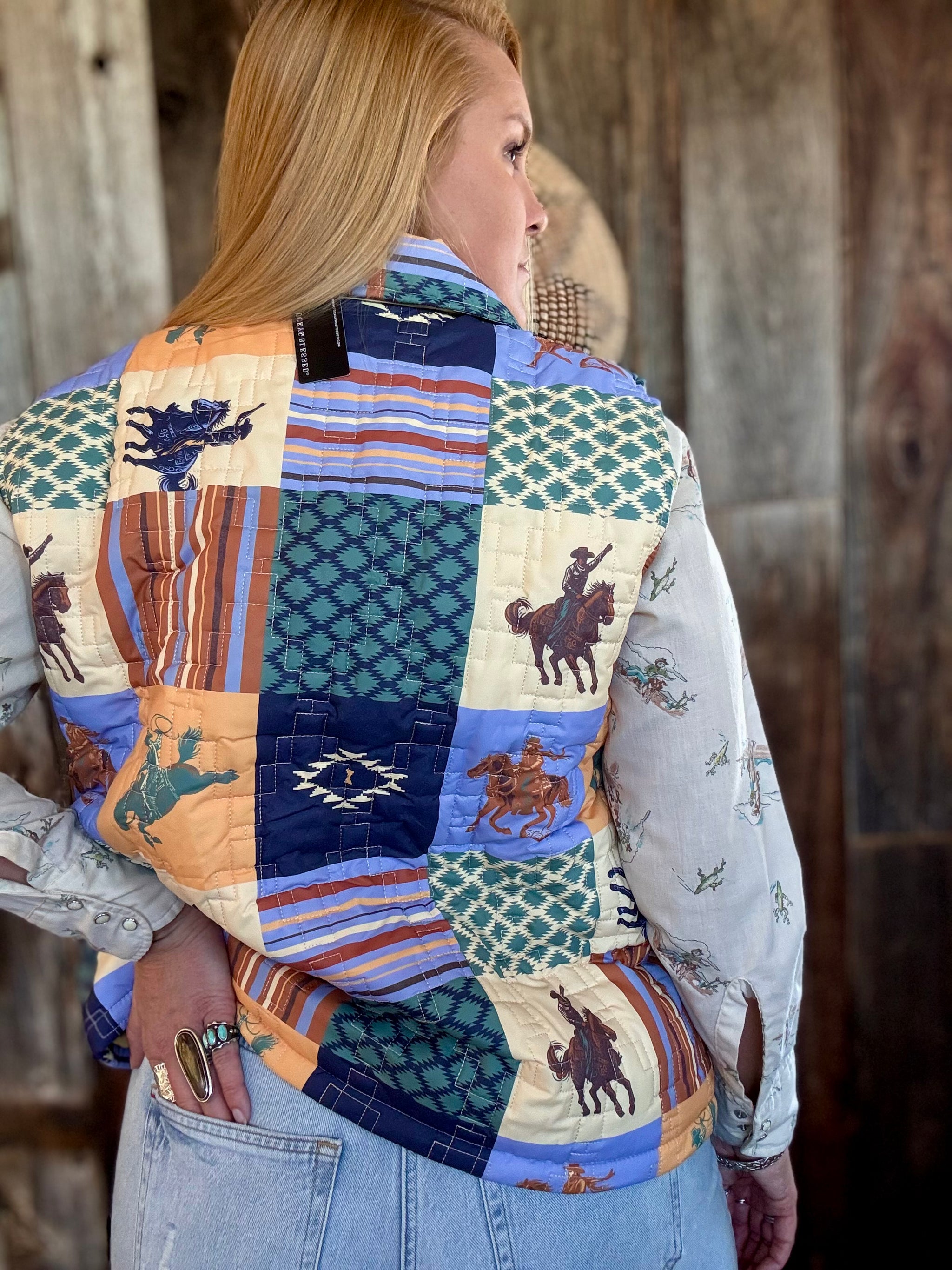 Patchwork Cowboy Printed Quilted Vest Puffer Vest Lightweight Rich Blend Of Earth Tones, Blues & Sage Green Hues Classic Southwestern...
