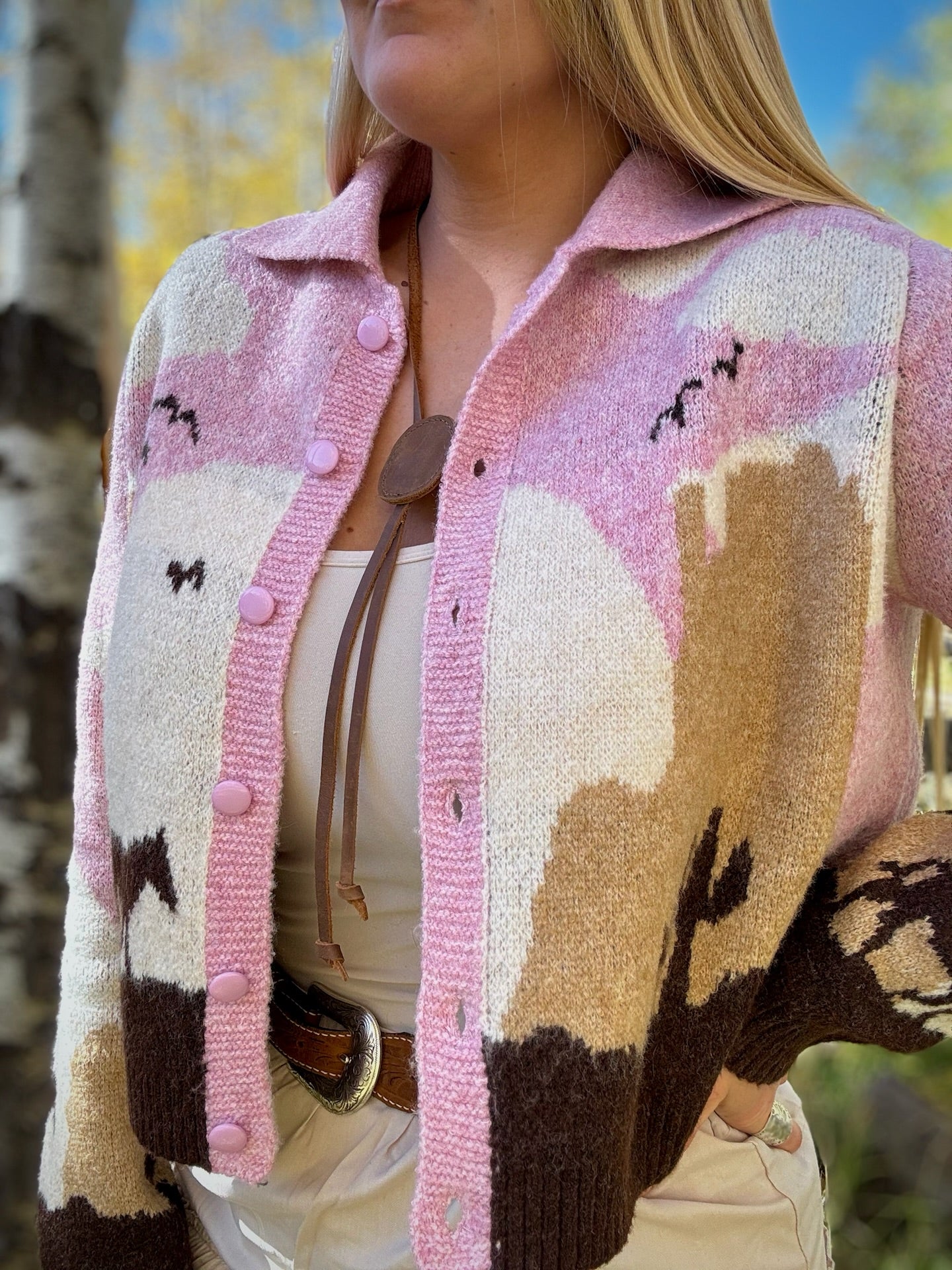 Sunset Canyon Knit Horse Cardigan Sweater Soft w/ Good Stretch Available In Pink/Taupe or Chambray/Gold Button Down Long Sleeve Collared Neckline...