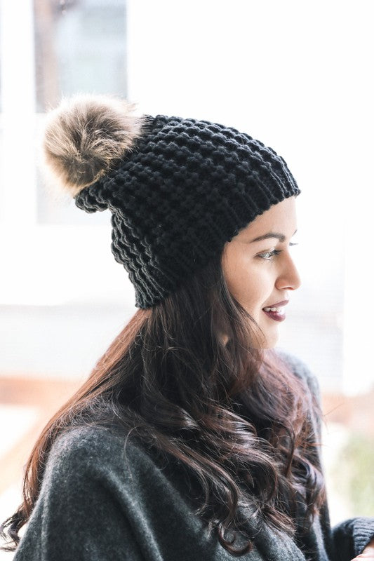 Cable Knit Beanie Faux Fur Pom Pom Classic Cable Knit Pattern Fold Over Style Available In Mustard, Black, Mauve &...