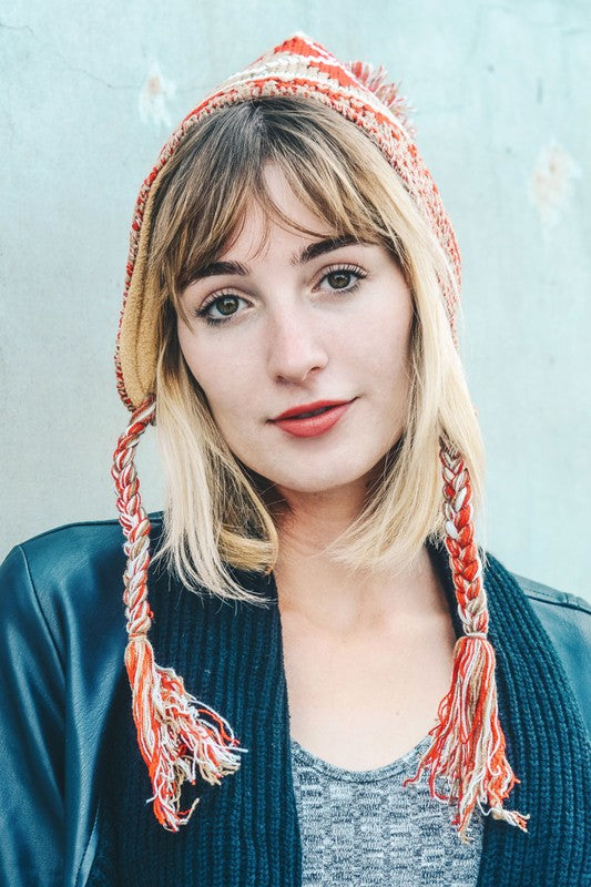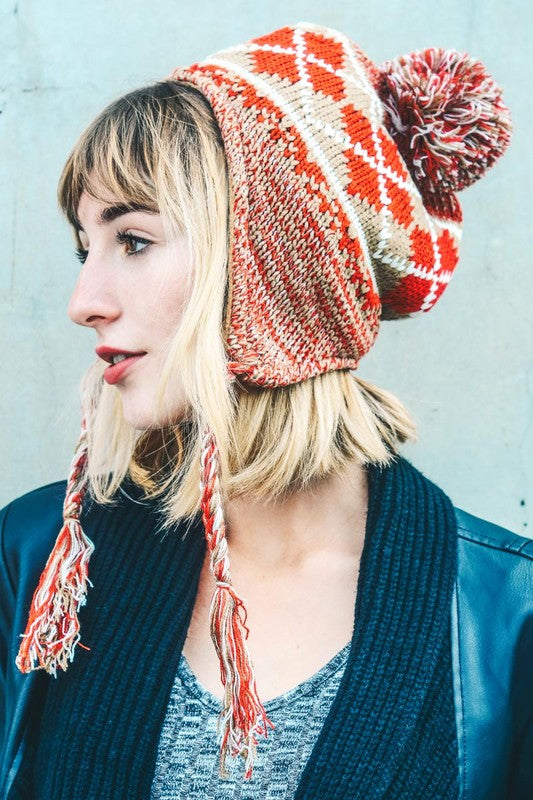 Knit Pom Pom Beanie Ear Flap Detail Nordic-inspired Pattern Braided Ties OSFM
