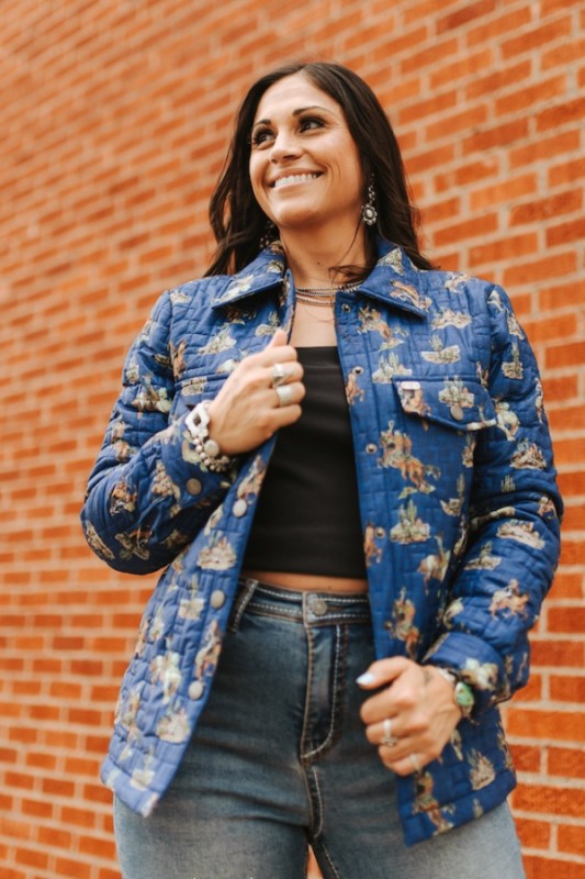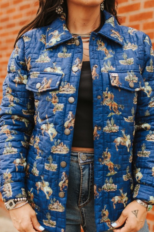 Vintage-Inspired Western Cowboy Scene Quilted Snap Jacket Quilted material Bold Western/cowboy print (including horses, cacti, and riders) Denim-blue color Snap...