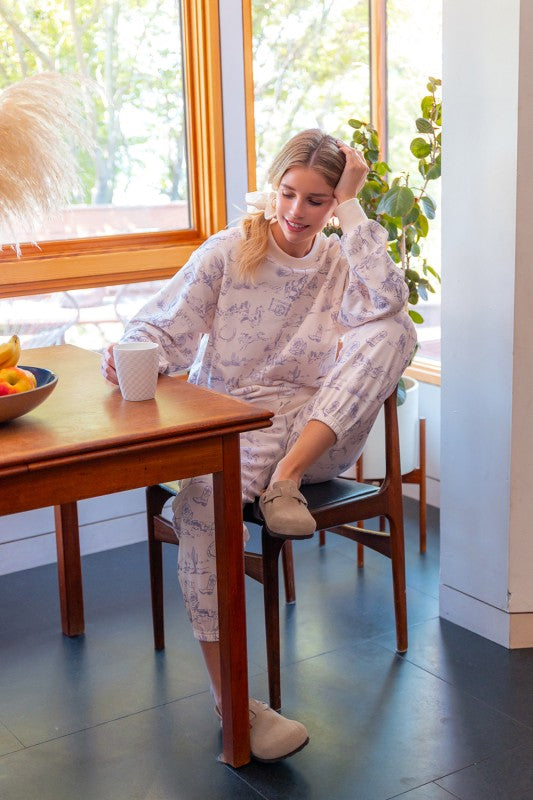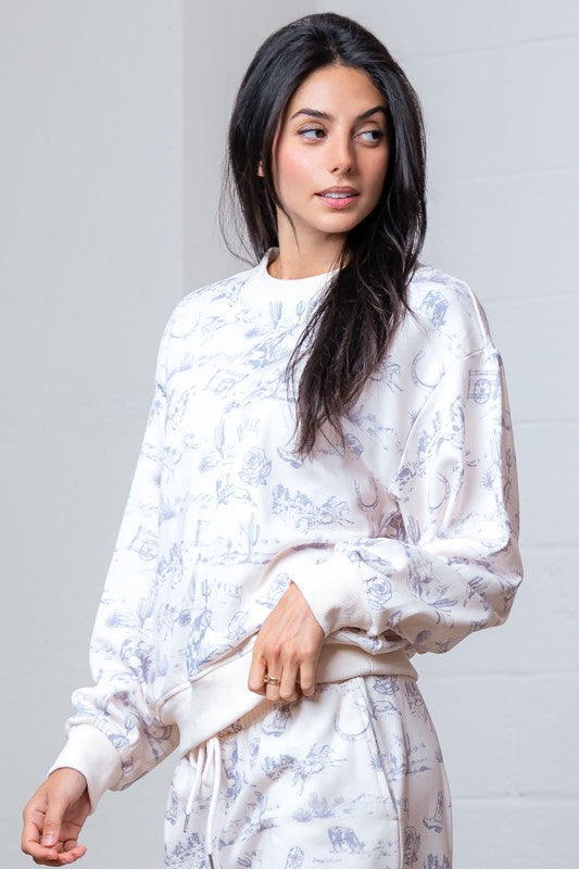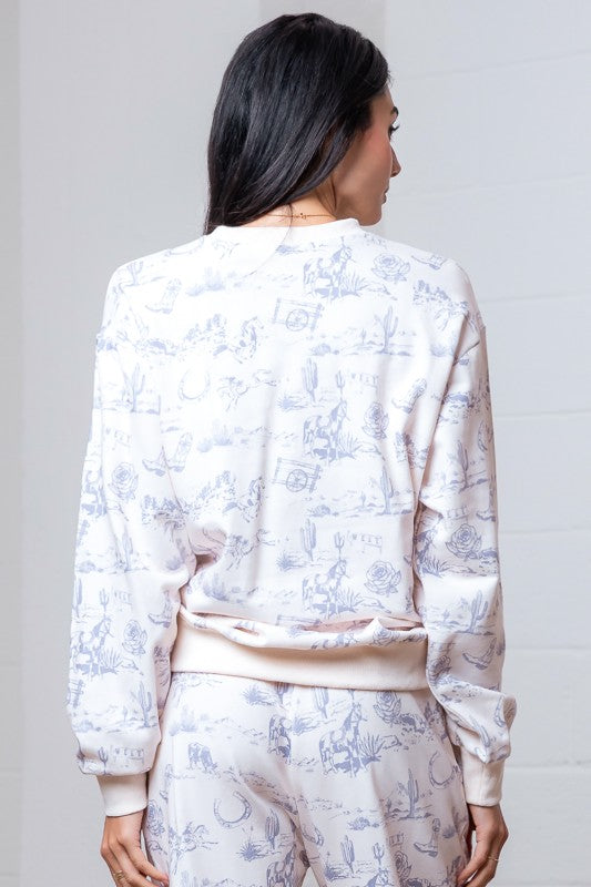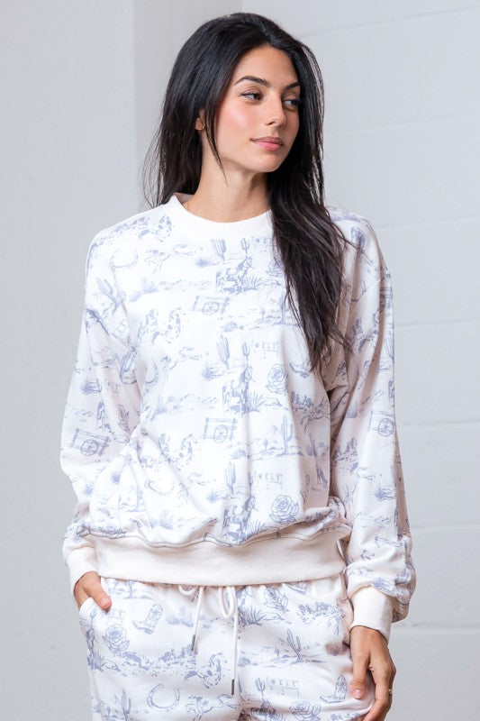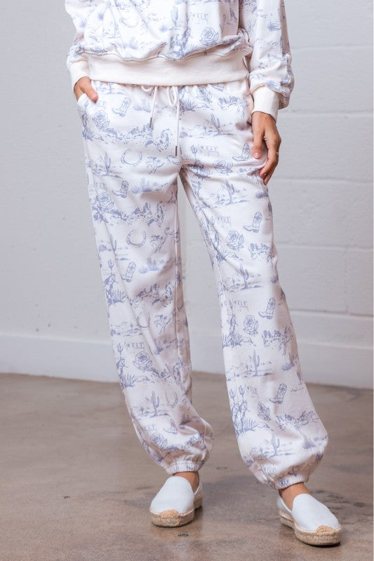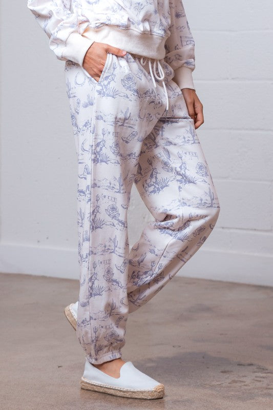 Western Sweat Set Ivory w/ Light Blue Western Print Sweat Pants w/ Side Pockets & Drawstring Soft w/ Slight Stretch...