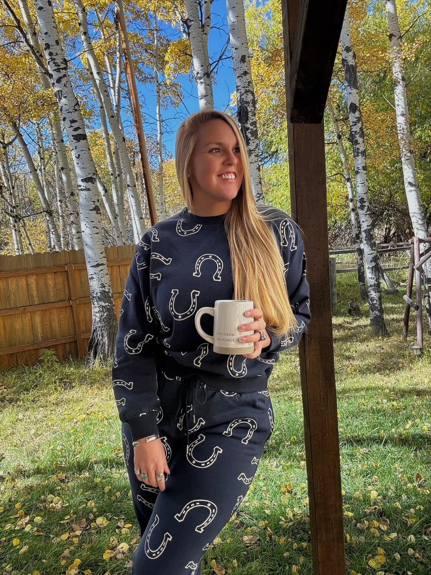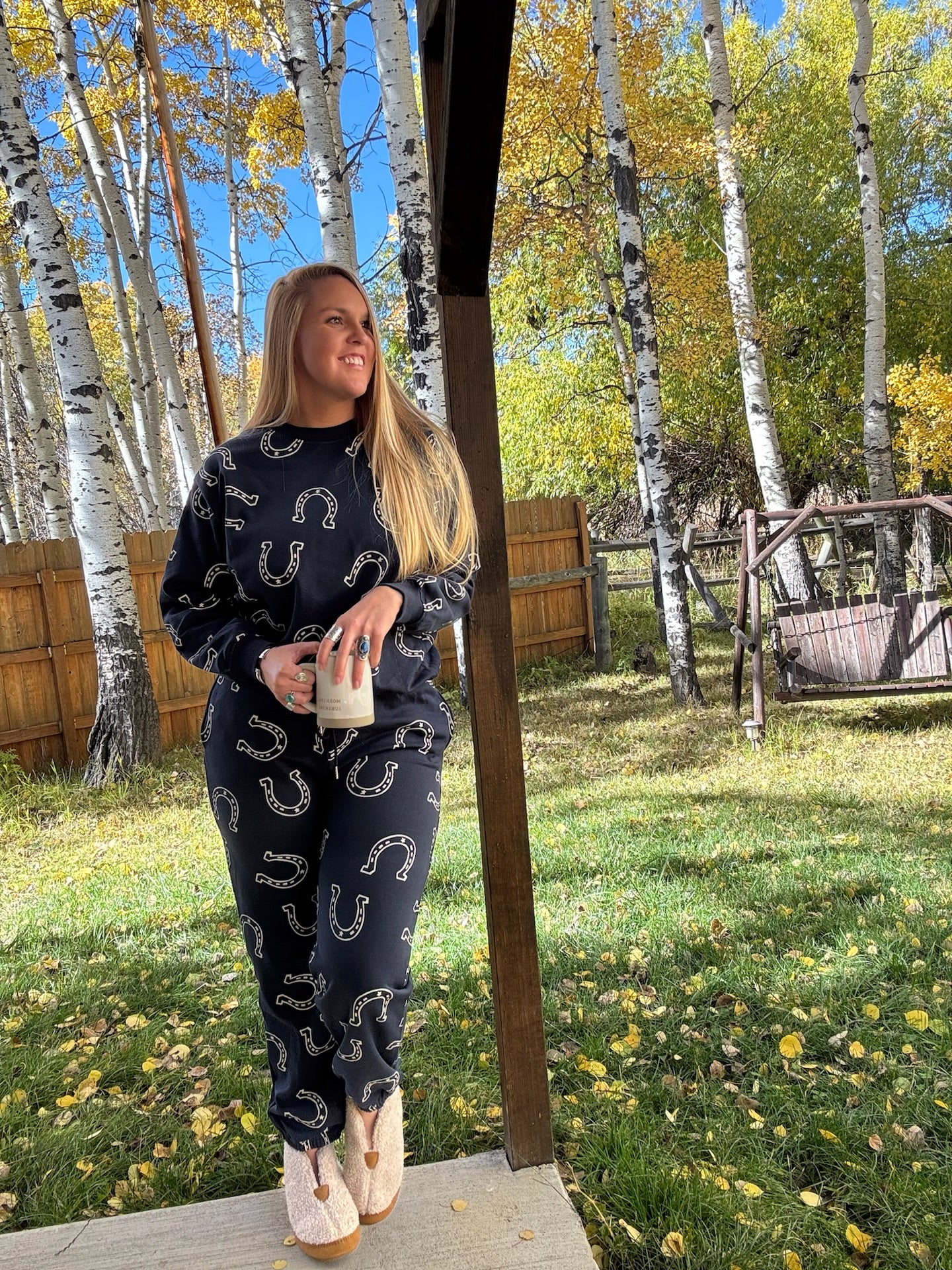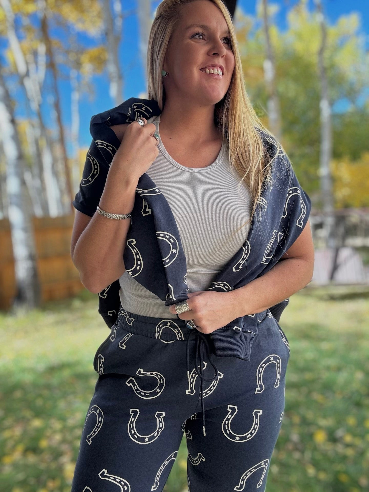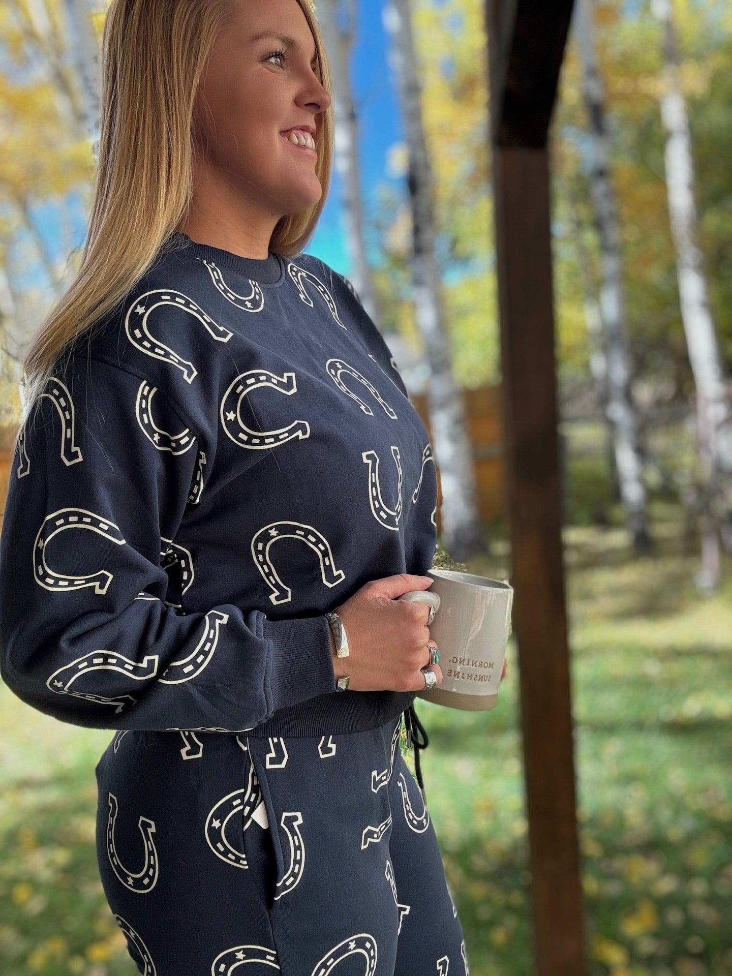Sweat Set Navy w/ Horseshoe Print Jogger Style Pants w/ Drawstring Crewneck Long Sleeve Sweatshirt Thicker Material 83% Cotton 17%...