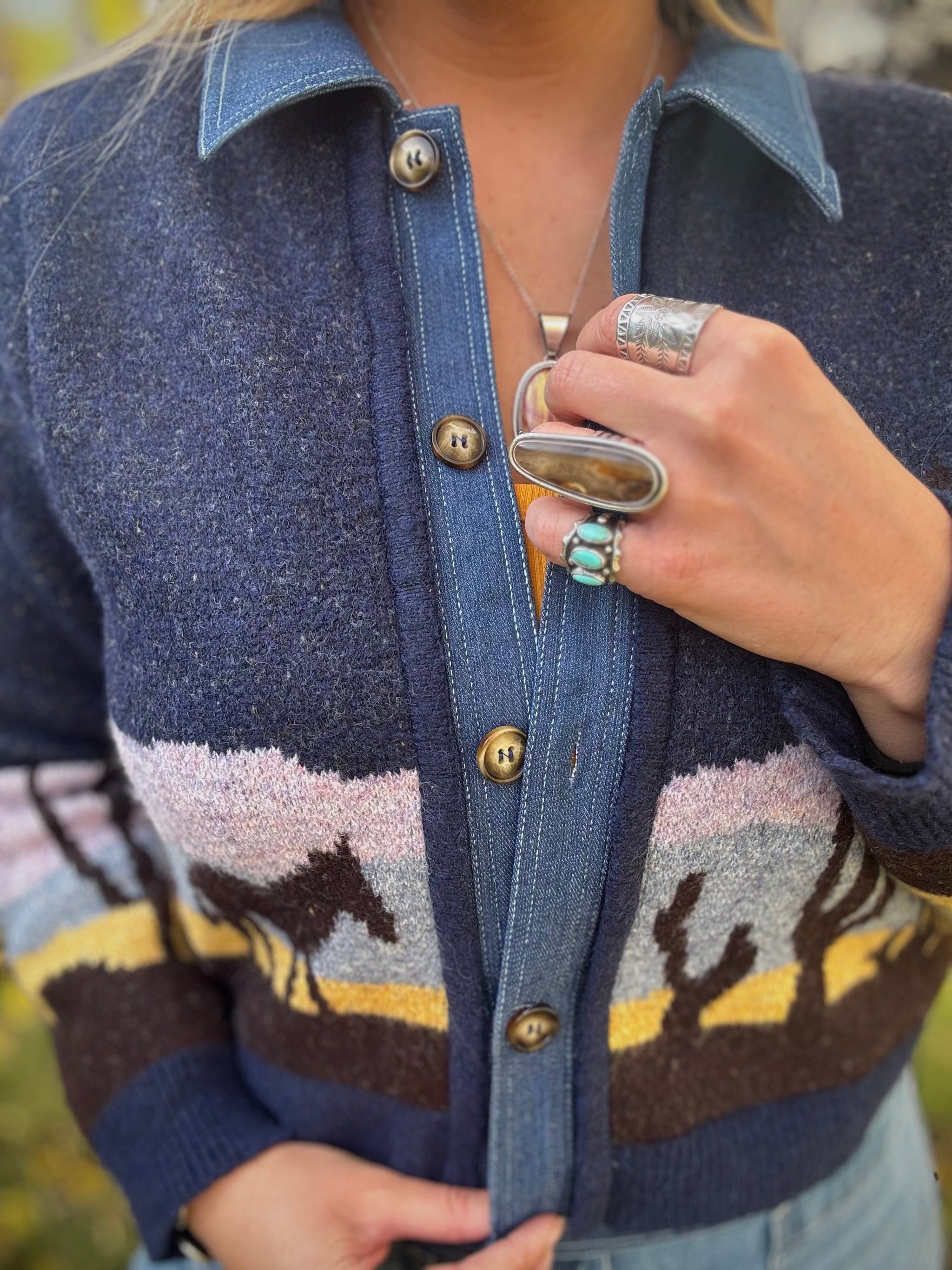 Denim Trim Sweater Jacket Soft Sweater In Blue Western Print Denim Details At The Collar & Hem Long Sleeve Button...