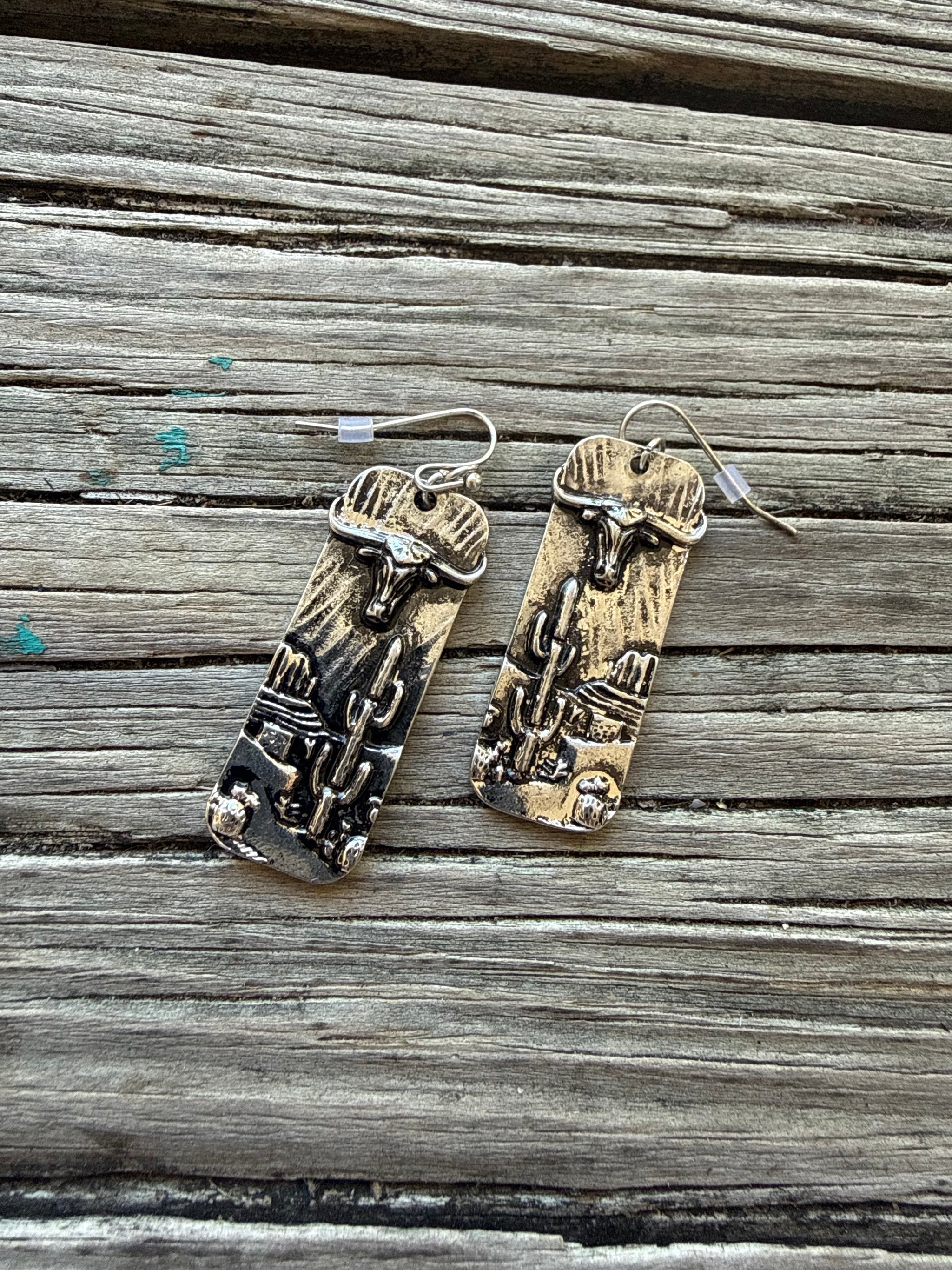 Silver Tag Earrings Bull & Desert Design Hook Style Rectangle Shape Brushed Silver 02252026