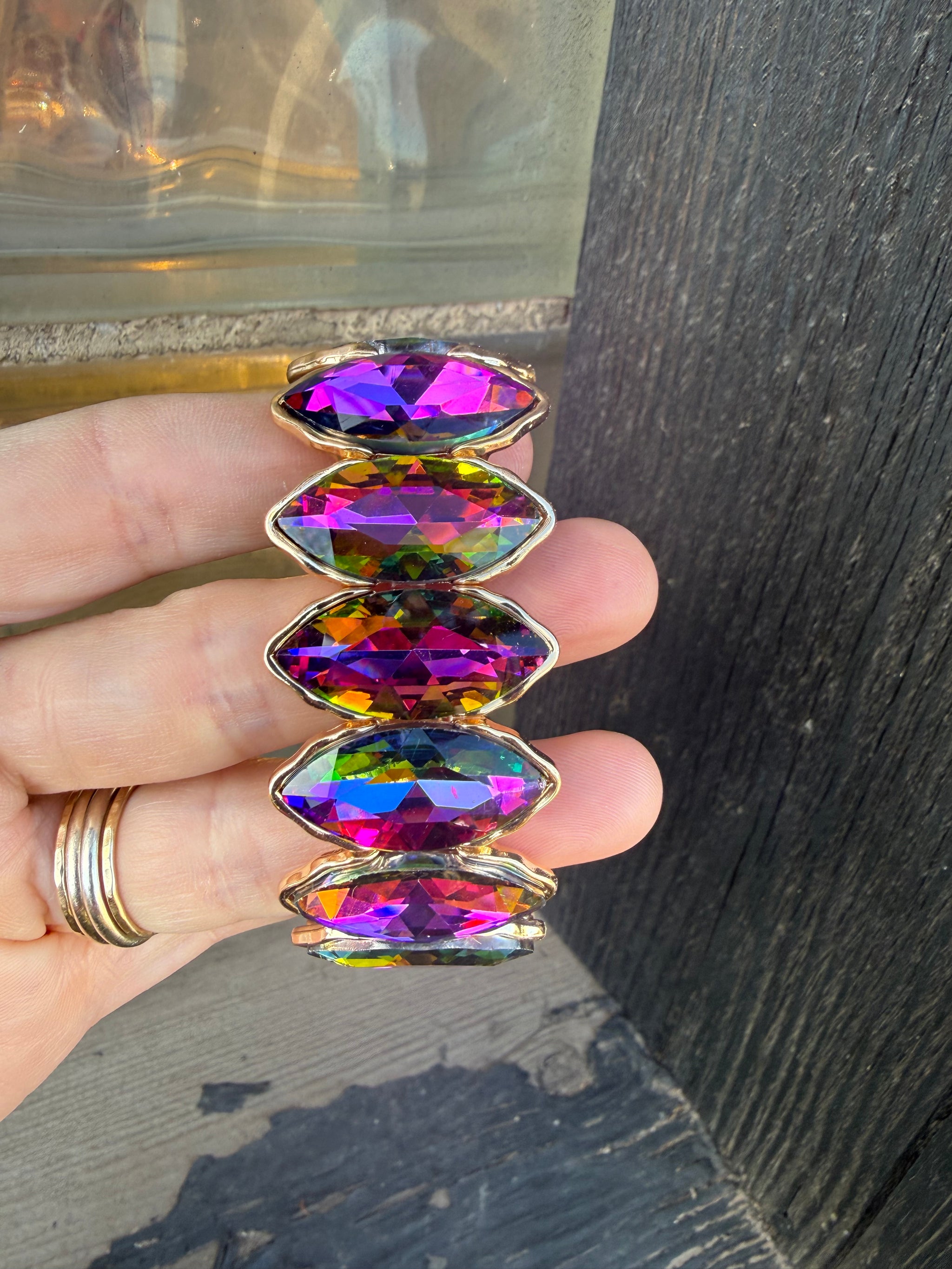 Gem Stone Bracelet Large Center Stone Surrounded By Smaller Stones In A Different Color Gold Accents Stretchy Style OSFM