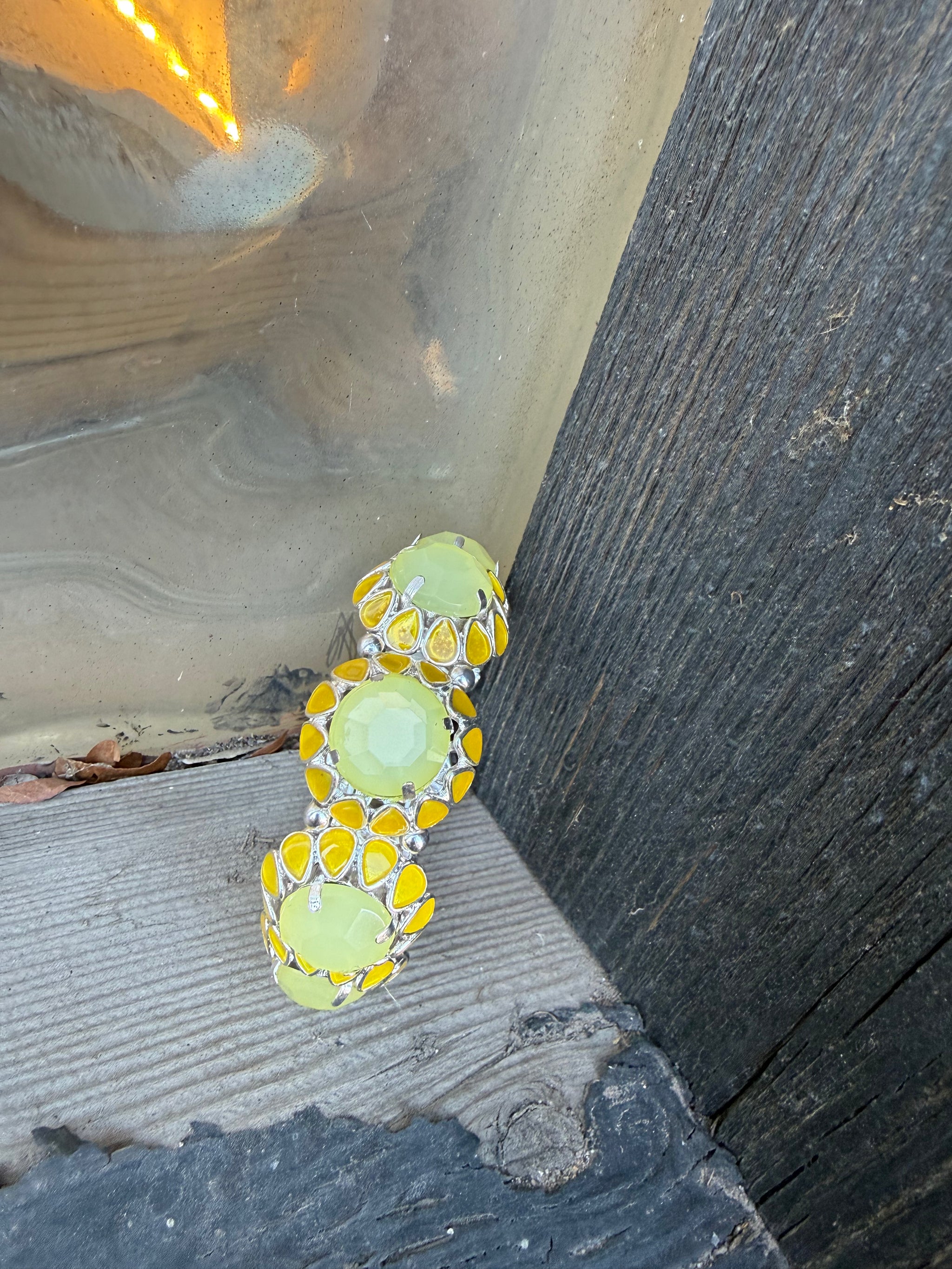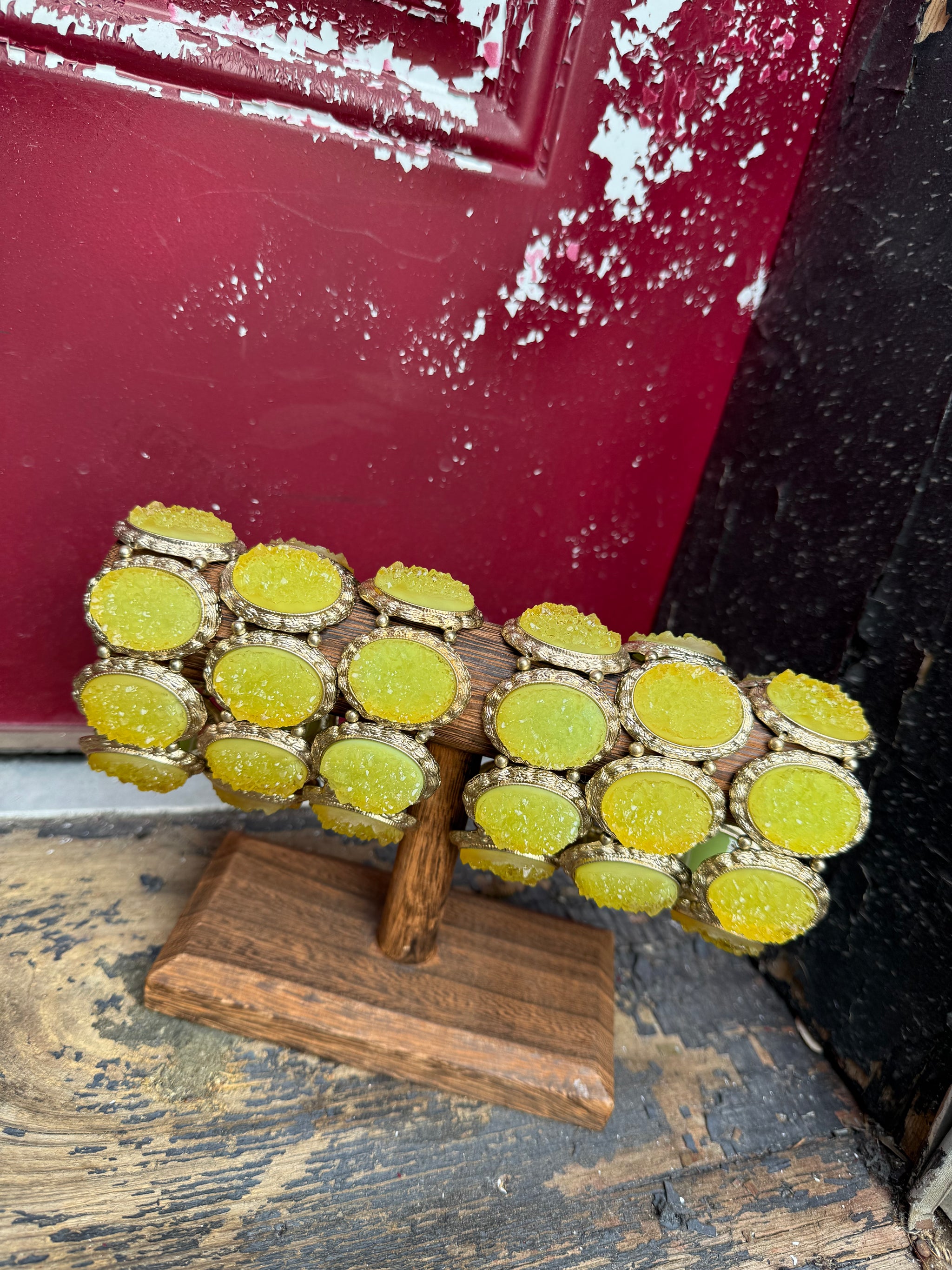 Druzy Crystal Stone Bracelet Antique Gold Setting Vintage Inspired Chartreuse Yellow Green Stretch Style Bracelet OSFM Sold Individually
