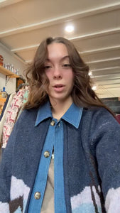 Denim Trim Sweater Jacket Soft Sweater In Blue Western Print Denim Details At The Collar & Hem Long Sleeve Button...