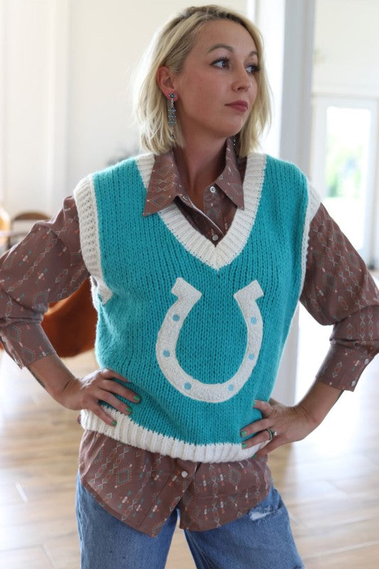 Horseshoe Knit Sweater Vest V-Neckline Soft Knit Fabric Relaxed Fit Available In Rust or Turquoise Sizing Recommendations Small 0/2/4 Medium...