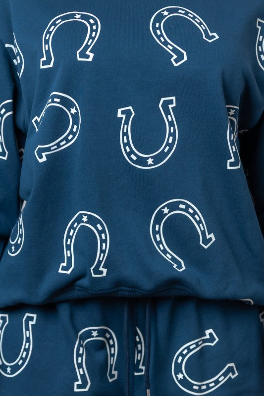 Sweat Set Navy w/ Horseshoe Print Jogger Style Pants w/ Drawstring Crewneck Long Sleeve Sweatshirt Thicker Material 83% Cotton 17%...